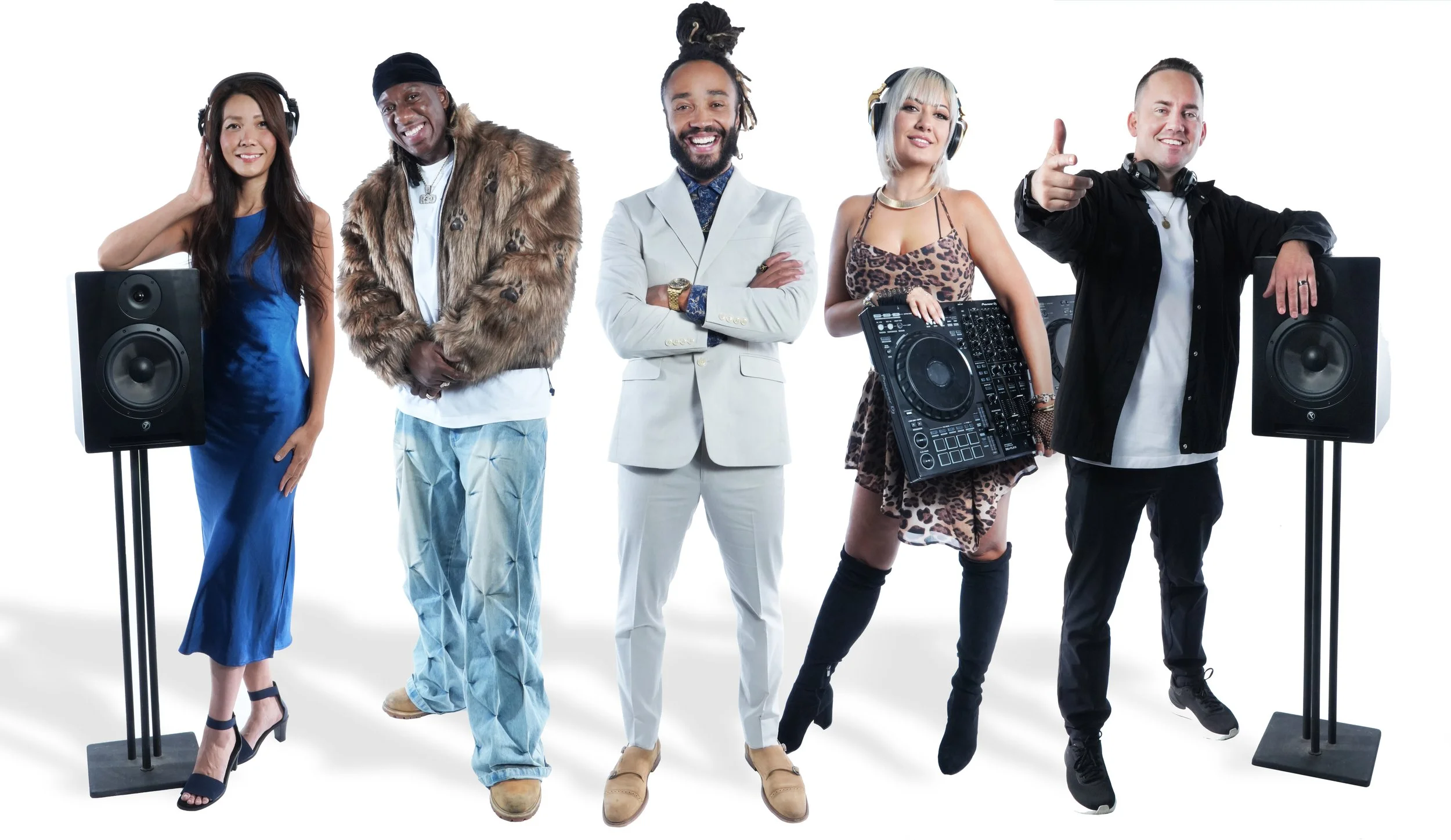Five diverse djs and entertainers standing with high quality audio equipment and speakers against a white background.