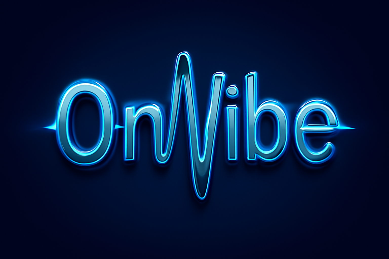 Neon sign displaying the words 'Onvibe', with a sound wave line through the middle as the V, in blue color.